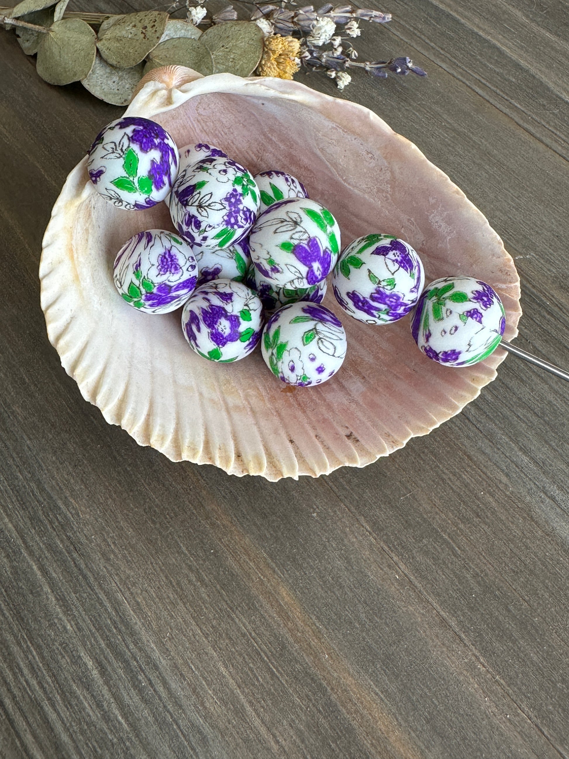 15mm Round Print Design Beads - Dark Purple Petunia P312